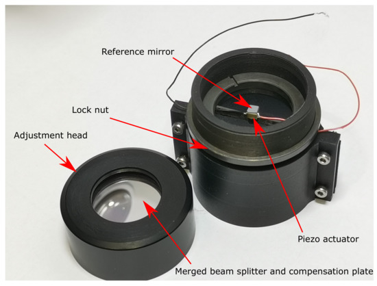 As mentioned before, a MA is developed to realize a Mirau type setup with oscillating reference mirror for the IDS. Figure 2 shows a detailed photograph of the MA. It consists of three parts: the main body, an adjustment head and a clamping ring. In order to avoid dependencies on the manufacturing tolerances, the beam splitter plate is adjustably mounted to balance the interferometer arms. Therefore, the adjustment head including the plate beam splitter and the compensation plate is connected to the main body by a fine-thread, which has a pitch of 0.5 mm according to DIN 13-3.