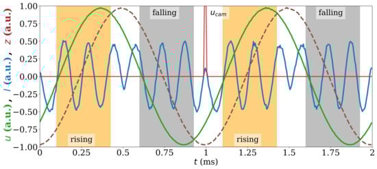 where and represent, respectively, the amplitude and the frequency of the oscillating reference mirror, leading to an OPLM. and describe a certain point on the surface under investigation. Such an interference signal (blue curve) for an OPLM resulting from the electrical actuator signal (green) and the related deflection of the reference mirror (brown) is depicted in Figure 3. Assuming a linear deflection regarding the rising and falling flank (see Figure 3) of the sinusoidal reference mirror movement a constant fringe frequency of the interference signal can be assumed. Therefore, the phase values of the corresponding sections of the interference signal are determined using a so-called single-point-DFT also known as lock-in method: