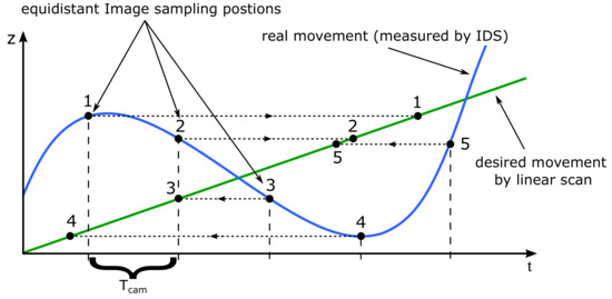 The correction of the CSI data occurs after the evaluation of the IDS signal is finished. For this purpose, the distance changes compared to the desired movement obtained from the IDS during a depth scan is used to rearrange the CSI data according to Figure 4. The rearranging process leads to non-equidistant sampling points of the low coherent interference signals. However, in the processing of CSI signals by commonly utilized algorithms we expect an equidistant sampling of the correlograms. Therefore, an interpolation of the data is performed to obtain sample points at equidistant intervals. A trigonometric interpolation [28] provides an appropriate method as reported in [14]. The correction described above does not change the initial signal envelope. Consequently, the 3D topography can be obtained from the corrected correlograms by using widespread CSI signal processing algorithms which use the interference contrast and phase of the signal [29,30,31,32]. In this work, the CSI signals are evaluated by a phase evaluation algorithm using the lock-in technique similar to Equation (4) and additionally, an envelope detection using the Hilbert transform in order to increase the unambiguous range of two adjacent height values. In this way, an axial repeatability in the subnanometer range is achieved. These algorithms and their combination is described in more detail in [24].