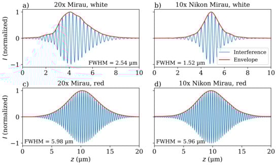 Different measurements are performed to illustrate the functioning of the MA. First, an aluminum mirror with a surface flatness less than is used as a measuring object to investigate optical aberrations and systematic deviations. As mentioned before, a beam splitter plate and a compensation plate of high optical quality is used. Nevertheless, tilting of these optical elements with respect to the optical axis, e.g., due to installation tolerances that may occur during assembly, can cause dispersion. A possibility to determine dispersion effects is given by the investigation of the measured interference signals. Therefore, the envelopes of signals of the custom-built 20x Mirau objective are compared with those of a commercial Mirau objective (Nikon 10x CF IC EPI Plan DI). Both objectives are directly applied in the same optical setup to keep the results the comparable. The signal envelopes for both MOs are obtained from the aluminum mirror using a white as well as a red LED for illumination. As shown in Figure 5a, significant difference between the envelopes (red curves) of both MOs can be observed for white light illumination. While the course of the signals obtained by the commercial objective is symmetrical, the course corresponding to the MA is asymmetric. Furthermore, the interference signal is broadened compared to the signal of the commercial system, which is illustrated by a full width at half maximum (FWHM) of 2.54 µm for the MA and 1.52 µm for the Nikon Mirau objective. With reference to the investigations of de Groot and Colonna de Lega [33] and under the assumption that the Mitutoyo MO is corrected to a high degree and only minor optical aberrations are present, the broadening of the envelope probably is caused mainly by dispersion. This assumption is confirmed comparing Figure 5c,d, where the same measurements are performed but using a red LED. Here, as a consequence of a narrower bandwidth the envelopes for both MOs are broadened compared to the signals obtained for a white LED. However, no significant difference is visible between the interference signals of both MOs. This is also corroborated by the difference of FWHMs obtained from the respective envelopes of the interference signals, which decrease from 1.02 µm for the white LED to 0.02 µm using the red LED as illumination source.