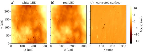 The measurement of the aluminum mirror shows systematic deviations in the measured surface topography, which still remain when the measuring field is laterally shifted. In order to separate the systematic deviations from the topography of the measured object, nine measurements are performed on latterly shifted locations at the aluminum mirror used as measuring object. The pixel-wise averaging of the nine measured surface topographies leads to the systematic deviation of each pixel, similar to the procedure used in [34,35,36]. This deviation is also known as residual flatness and includes the systematic deviations due to the unevenness of the reference mirror. In Figure 6a, the illustrated residual flatness is measured using a white LED, whereas for the result depicted in Figure 6b, a red LED is used. Similarities in both topographies are apparent immediately. The topography in Figure 6a is slightly higher compared to that depicted in Figure 6b. This is also illustrated by calculating the standard deviations = 3.47 nm for the surface obtained using the white LED and the red one with = 3.25 nm. However, the specification of the standard deviation to represent the residual flatness is misleading, since the determined systematic deviations differ stronger at the edges compared to the center (see Figure 6). The standard deviation is reduced to 0.995 nm for a subtraction of the two topographies from each other and a predominantly uniform shape occurs. Consequently, deviations in flatness of the Mirau CSI are not mainly caused by dispersion and can be attributed to other influences such as flatness deviations or contaminations of the reference mirror or other system-related wavefront errors. The residual flatness can be used for the calibration of the system by pixel-wise subtracting the residual flatness from each performed topography measurement. An application is shown in Figure 6c, where an additional measurement of the aluminum mirror is calibrated by subtracting the residual flatness shown in Figure 6a from the measured topography. As depicted in the Figure 6c a nearly uniform topography occurs with a standard deviation of = 0.62 nm. Consequently, subtracting the residual flatness is a suitable approach for correcting the measured topography data. Therefore, this correction approach is considered in all following results in order to reduce systematic errors of the measured surface topographies.