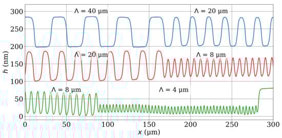 In addition, a resolution standard (type RS-M from Simetrics GmbH) comprising several gratings of period lengths from 4 µm to 800 µm with a nominal step height of 90 nm is used [37]. The results are shown in Figure 7.