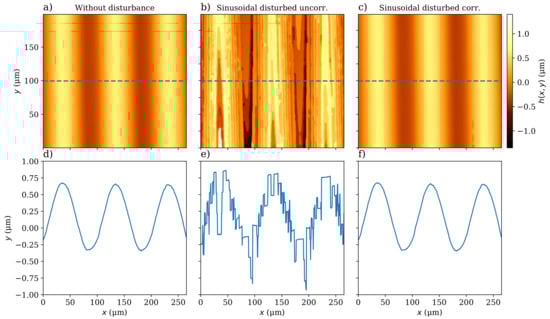 Measured sinusoidal standard with 1 µm peak-to-valley amplitude and 100 µm period length. (a) Topographies obtained without disturbances on a vibration-damping table, (b) disturbed by a sinusoidal vibration with an amplitude of nm and an oscillation frequency of 8 Hz, (c) same topography as shown in panel (b) but corrected according to the described compensation method, (d–f) the corresponding profiles marked by the blue dashed line in the (a–c) surface topographies.