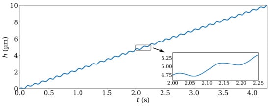 Then, a well-defined vibration is applied. For this purpose, the object to be measured is sinusoidally deflected by a piezo-driven stage with an amplitude of 200 nm and an oscillation frequency of 8 Hz. Figure 9b shows the impact of the disturbance on the measured surface topography. There is a significant difference to the disturbance-free surface topography, and the sinusoidal structure can only be suspected. Besides, the CSI signal the laser interferometric signal of the IDS is detected during the depth scanning process, leading to the course of height values depicted in Figure 10. Due to the acquisition rate of 1000 height values per second, the changing height caused by the depth scan (linear part of the course) and the superimposed oscillation of the vibration could be detected by the IDS. Consequently, the frames captured by the CCD camera can be resorted according to the distance values measured by the IDS. The evaluation of the sorted and trigonometrically interpolated CSI signals using a phase analyzing algorithm leads to the surface topography depicted in Figure 9c. A comparison with the unaffected surface topography (see Figure 9a) shows hardly any deviation. The determined peak-to-valley amplitude of the surface obtained from the corrected data corresponds to 0.998 µm, while the measured amplitude of the surface topography measured without disturbance is 0.992 µm. In both measurements the period length results in 100 µm. Therefore, the influences of the disturbance on the measured surface is successfully corrected.