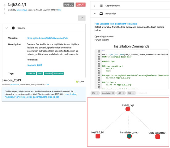 Figure 1. Screenshots of various OpenBio.eu components. A tool (Neji) contains the description, installation instructions, and bibliographic references (top left). ROs are accompanied by directly executable source code (top right). The lower left shows the scientific paper linked with this tool and the lower right shows a graph with a workflow that uses this tool (Neji) with another RO which is an ontology (OBO Gene Ontology).