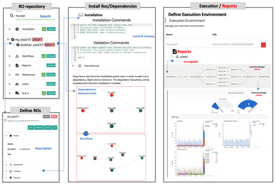 The OpenBio.eu platform is organized around four basic building-blocks (Figure 3): (a) the RO repository, which is equipped with free-text search operations to locate the TDW object most relevant to the task at hand, workflow execution reports, references, and (potential) query-answering discourse sessions (upper-left); (b) a module to define/describe a TDW (lower-left); (c) the platform’s core module where the installation (with validation) of TDW objects takes place, along with the definition of their dependencies (arrows between objects), as well as the composition of workflows (a GUI is provided to drag-and-drop the needed ROs); and (d) the module to define the execution environment and the actual execution of workflows (i.e., the Airflow execution manager that operates on CWL forms of workflows) accompanied by a resource manager (serviced by netdata) to monitor the execution process.