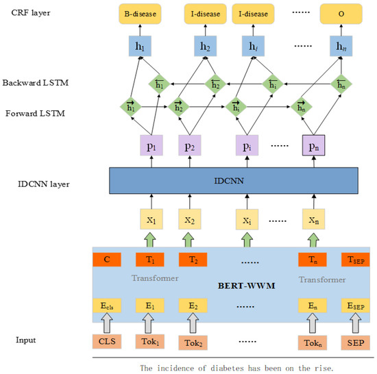 The overall architecture of the proposed model named BIBC for NER is shown in Figure 2. As is shown by the figure, the whole model structure consists of four parts, namely BERT, IDCNN, bidirectional LSTM, and CRF. A modified BERT-WWM model is used to train on a massive unlabeled corpus for feature supplementation, which greatly enhances the semantic representation between words or phrases through deep and continuous learning. In addition, the IDCNN layer is added to make the model take into account both local and global features by IDCNN and bidirectional LSTM, thus making the whole model achieve better results on diabetes medical literature. The specific implementation process of the BIBC-based named entity recognition model consists of the following parts:
