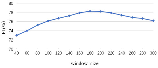 As shown in Figure 6, the validation on the BERT-BiLSTM-CRF model shows that a value around 180 is relatively good in F1 score. If the sliding window value is too small, the sentence contains too little contextual information, which will lead to the degradation of the effect; and, if the value is large, the sentence length is too large, which is not conducive to the training of the model, so, in this paper, we select a of 180. Our analysis of the data characteristics shows that the maximum length of the entity in the dataset is 14. In order to avoid the entity being divided and retain some contextual information, the is set to 30, so the size of the divided sentences is .