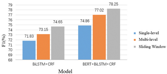 As the experimental comparison using different data processing methods on different models can be seen from Figure 7, the method using sliding windows is better than the one using punctuation symbols to divide the data, and the worst results are one level of punctuation symbols to divide the data. It is because the part of sentences obtained by using a single level of punctuation symbols division is too long, which affects the training performance of the model. In addition, the direct interception of sentences with too large length will lead to a decrease in information capture. The data set is not very standardized because of the format conversion, and using multi-level punctuation may divide two entities in two sentences, resulting in the entity segmentation not being recognized correctly. All the data used in the following models are experimentally validated using the processing that works best.