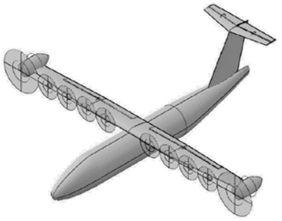 The hybrid-electric configuration is named “Motorization 2”. This configuration consisted of a modified version of the regional aircraft ATR42, having a new wing of equal length and higher aspect ratio, two tip propellers to reduce induced drag, and a distributed electric propulsion (DEP) system, composed of four propellers per side, as in Figure 5. This configuration was selected among several proposal aircraft generated and investigated by our partner, the University of Naples [22].