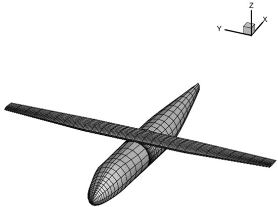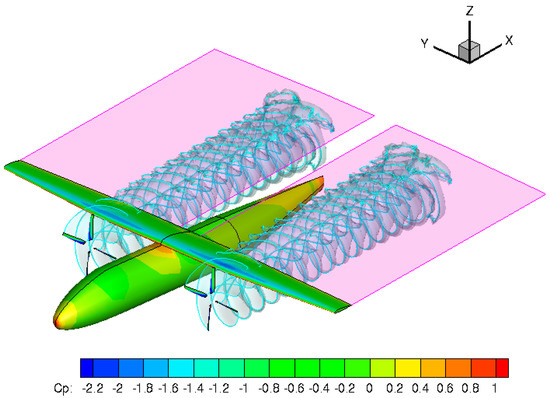 Each of the four DEP propellers consisted of six blades having length equal to 1.100 m. The blade pitch was fixed. The hub was not modelled. The sense of rotation of the starboard-side propellers, selected as the reference one, was counter-clockwise when viewed from the front of the rotor disk. Each blade geometry was discretized by 40 chordwise panels × 13 spanwise panels. The resulting rotor blade geometry is shown in Figure 9b.