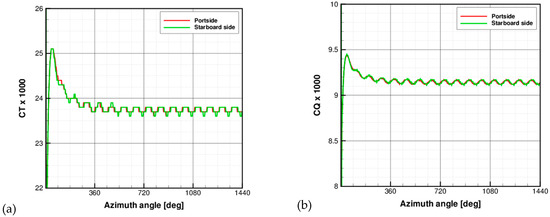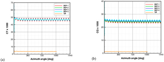 The propellers were designed and optimized by CIRA. The tip propeller consisted of four blades having length equal to 1.965 m and was equipped with feathering hinge for each blade. The hub was not modelled. The sense of rotation of the starboard-side propeller, selected as the reference one, was counter-clockwise when viewed from the front of the rotor disk. Each blade geometry was discretized by 40 chordwise panels × 13 spanwise panels. The resulting rotor blade geometry is shown in Figure 9a.