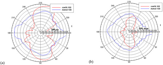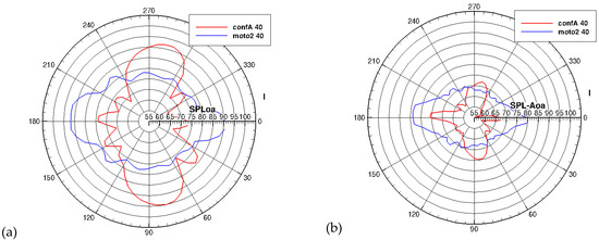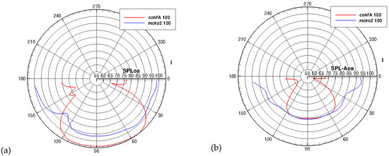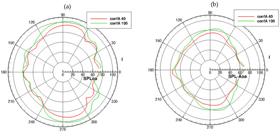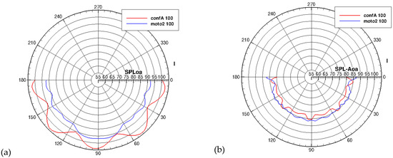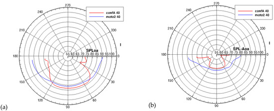 Graphical representation of equal loudness contours for the conventional (a) and hybrid (b) configurations, in terms of LAE (dB-A), for a standard runway-36 landing.