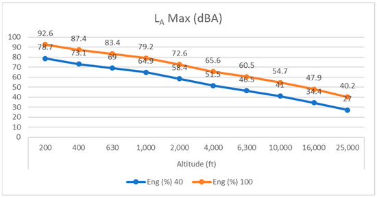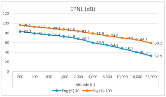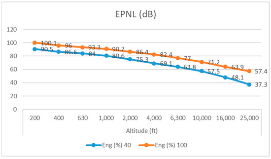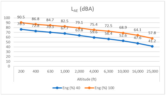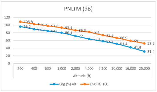 The numerical methodology for the calculation of the NPD data of a given aircraft, simply considers simulations of flyovers of the given aircraft, properly acoustically characterized, in compliance with the regulation proposed by Society of Automotive Engineers SAE [3] for the calculation of airplane noise in the vicinity of airports. Each of the numerical simulations considers the acoustic source flying along a straight trajectory above a hypothetical runaway at a fixed altitude and with a given engine-power setting. By varying the altitude and engine-power settings, it is possible to fill a database that can correlate the value of sound exposure levels (LAE) or effective perceived noise level (EPNL), in the centre of the hypothetical runaway, to each couple (engine-power setting, altitude) [14,15]. Also, the peak value of A-weighted instantaneous sound level, LAMax, and the tone-corrected perceived noise level maximum value, PNLTM, are desirable in order to have a complete acoustic data set. This very fast and analytical methodology is able to simulate an expansive experimental campaign and provides the NPD curves for the Integrated Noise Model INM and/or Aviation Environmental Design Tool AEDT [2].