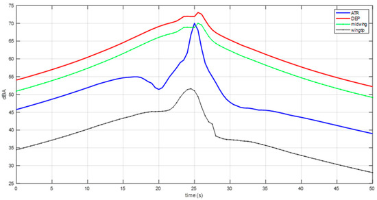 The results show the DEP configuration was significantly louder than the ATR one. The higher the altitude, the lower the difference between the two configurations; this is related to the atmospheric absorption and the characteristic spectral contents of the two sources. Concerning the greater loudness of the DEP configuration, Figure 38 compares the A-weighted instantaneous sound levels (LA) for the two configurations at 40% engine power and an altitude of 400 ft. The solid red line represents the time variation of LA for the DEP configuration along the numerical simulation of the acoustic experiment, while the blue solid line is the same for the ATR configuration. It is evident that the DEP configuration always had greater sound levels, mainly due the acoustic effect of the mid-wing propellers (perfectly equal and reported as dash-dotted green lines), while the two wingtip propellers (perfectly equal and reported as dash-dotted black lines) had negligible acoustic contributions.