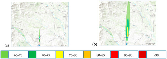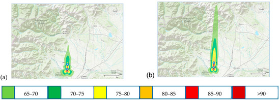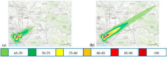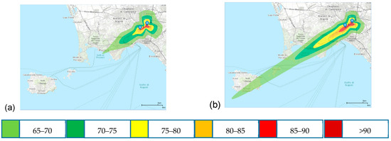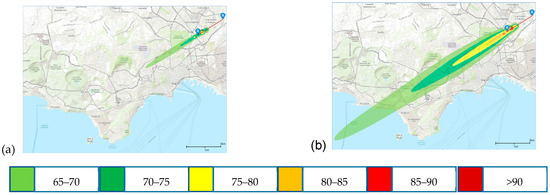 Graphical representation of equal loudness contours for the conventional (a) and hybrid (b) configurations, in terms of LAE (dB-A), for a standard runway-06 landing.