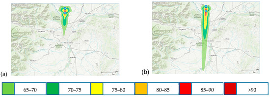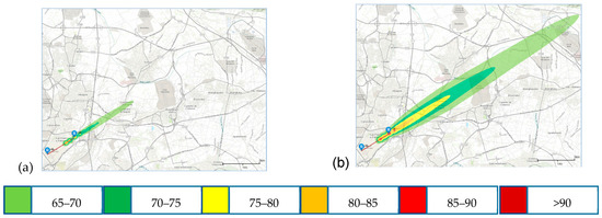 Graphical representation of equal loudness contours for the conventional (a) and hybrid (b) configurations, in terms of LAE (dB-A), for a standard runway-06 take-off.