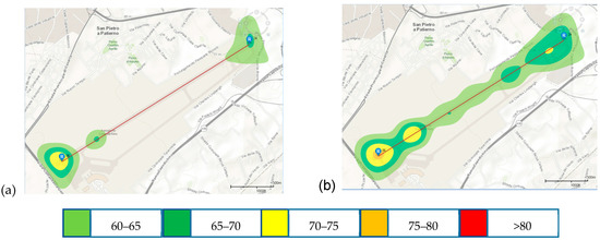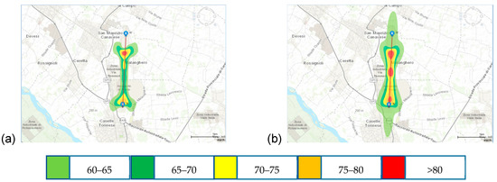 LDEN (dB-A) of the assessed traffic scenario for the conventional (a) and hybrid (b) configurations.