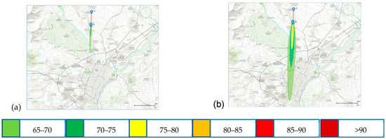 In Figure 43, noise contour surfaces, expressed in geo-localized LDEN, are illustrated for the conventional and hybrid configurations. Observing the graphic representation, we can appreciate the extension of its contours and the invested territorial areas.