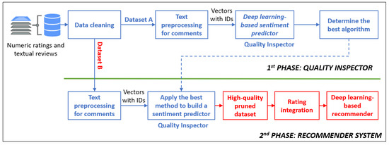Notice that two databases, one for each phase, are employed: dataset A and dataset B. They have the same structure, identical features, and an equal total number of data rows, but have different records. The main motivations to work with two sets are: (a) to apply dataset A in the first phase mainly to determine the best algorithm to model a sentiment predictor, and (b) to exploit dataset B in the second phase mostly to run the complete proposed procedure, composed of a quality inspector plus a recommender engine, completely from cero with a sole database.