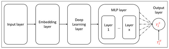 Three inputs are used to generate an accurate product recommendation: (a) user identification, (b) item identification, and (c) , which is an integer value between 1 and 5 derived by Equation (3). Formally, let be the user ID vector of record j, be the item ID vector of record j, and be the preference rating of record j. The vectors and are then projected to a dense vector space as real-value vectors and , respectively, through an embedding layer. The interaction between the characteristics of u and i is then modeled and captured by an interaction function. This is the input for the deep neural network. The deep learning-based rating predictor of a product recommender can then be modeled as follow: