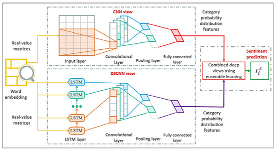 Two Deep Views Ensemble method (TDVE) is a modified text classification model inspired by the methodology proposed by [28]. Their suggested framework was adapted to the specific case of this study. Thus, the factorization machines-based co-training component is excluded, the prediction component is slightly modified, and the two deep views module is used as the core idea of this fourth model. The two deep views are: (1) a CNN, which focuses on extracting local features, and (2) a Dependency-Sensitive Convolutional Neural Network (DSCNN), which focuses on capturing long-distance dependency data. The attention of each one achieves the characteristic of two conditionally independent, and sufficient views, to create a fused sentiment predictor through ensemble learning. Figure 3 shows the design of this method.