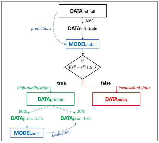 In the first task, we randomly select 80% of records from to form . The , a dataset containing noise, is used to train and produce a by using the reviews as features and the ratings as labels. In the second task, will be used for rating predictions using . As mentioned in Equation (1), if , the i-th review-rating record is considered as high-quality data and will be conserved and saved in the dataset . On the other hand, if , the record is considered inconsistent and will be discarded. Here, the threshold k must be equal to 0, as it is critical to be strict and just keep the data that have high probabilities of being consistent. In the third task, , randomly derived from the high-quality dataset , is utilized to construct a for each algorithm. Naturally, is tested using the to report the performance indicators.