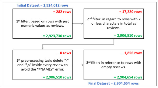 Unsurprisingly, the records in the preliminary dataset may contain many no valuable data such as (a) records with only a numeric value as the review, (b) rows with only two or one character in total as the review, (c) reviews with specific characters that generate an error in their specific cells when exporting the data file to Excel, or (d) rows with just a blank cell instead of a review. Consequently, a data cleaning process that includes three filters, and one preprocessing task is conducted. Figure 7 details the data cleaning process.