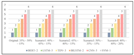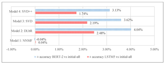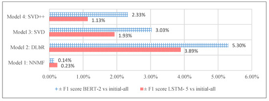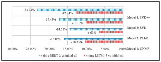 Similarly, Figure 10 reports that DLbR enhances the F1 score by 5.30% and 3.89% when exploiting BERT-2 and LSTM-5, respectively. The lowest boost is generated by NNMF, which improves the F1 score by 0.14% when using and 0.23% when utilizing . Regarding SVD++ and SVD, both experienced a regular F1 score increase between 1.13% and 3.03% when applying BERT-2 or LSTM-5 quality inspectors. Likewise, Figure 11 proves the positive impact on accuracy when applying a quality inspector, where all the models, except for NNMF, reported a steady accuracy boost between 1.74% and 4.04%. Finally, as shown in Figure 12, total running time is the indicator that encountered the best enhancements, as the four models report a total running time reduction between 6.60% and 23.23% when using a cleaned version of the data.