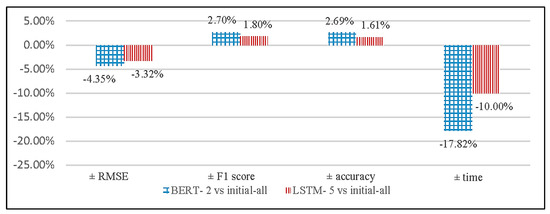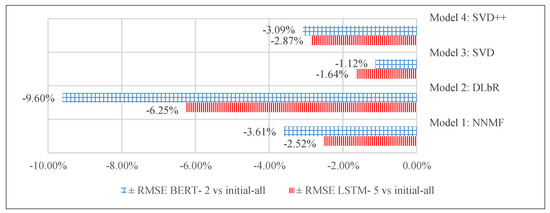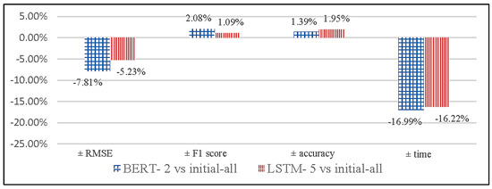 Comparison of the variations produced when using LSTM-5 or BERT-2 against the dataset , of the four models in the RMSE indicator.