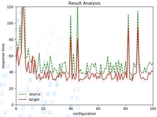 Generally, performance values are expected to differ in different database versions for a given configuration. Fortunately, performance models typically exhibit similarities across different database versions in the configuration space. An experiment is carried out to verify this observation, and the results are shown in Figure 2. We randomly select 100 valid configurations in MySQL, and obtain the performance measurements in both 5.5 and 8.0 versions, which are indicated by source and target, respectively. On the bases of the experimental results and some previous researches [,], we accept that the performance responses in source domain and target domain are similar in configuration space when database version changes.