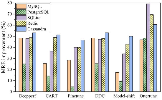 As expected, our proposed method has achieved better performance than all other six algorithms. Specifically, for five subject database systems, PCK outperforms all other six baseline algorithms: 24.99–53.18% improvement over DeepPerf, 14.20–51.19% improvement over CART, 4.42–46.58% improvement over Finetune, 25.26–53.13% improvement over DDC, 9.34–50.03% improvement over Model-shift, and 46.80–69.42% over Ottertune. The improvement percentages are shown in Figure 4. For the sake of simplicity, the data in Figure 4 is obtained by averaging the MRE data of different sample sizes in each subject database system.