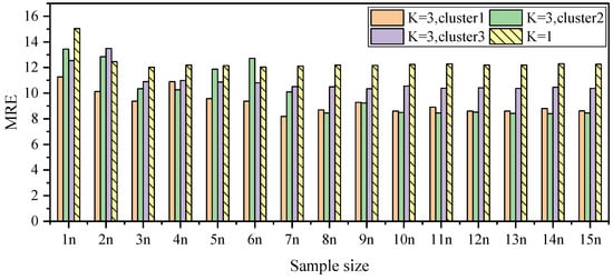 In order to further verify the necessity of PCK, we compare the MRE in different clusters () with the MRE without clustering () in MySQL, the result is shown in Figure 5. We observe that the MRE without clustering is higher than the MRE in three different clusters in almost all sample sizes. Finally, the optimal prediction accuracy is achieved in this case (). In addition, PCK achieves the best prediction performance in Redis (version 4.0.1–6.0.5) and PostgreSQL (version 9.3–11.0) when , and in Cassandra (version 2.1.0–3.11.6), in SQLite (version 3.31.1–3.36.0), respectively. The reason for the small K in Cassandra is its larger configuration space, thus the insufficient measurements may lead to inaccurate partitioning.