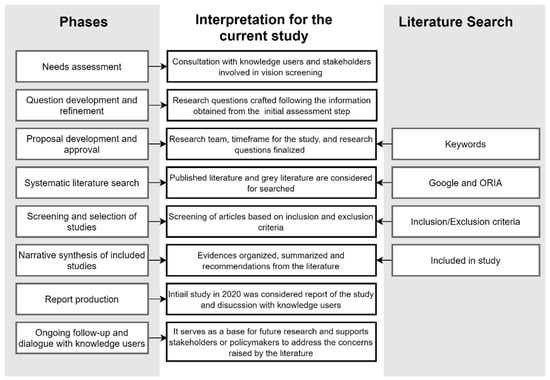 The intention here is to define the necessary preconditions, such as who influences the handling of vision problems, and how technologies can better support their work. To map all involved stakeholders and technologies, we performed this rapid review, following the eight phases defined by Khangura et al. [25] and the process described in Figure 1. The main reason for this approach was the need to bring together knowledge from health, education and technology development, three broad domains and identify essential gaps that needed to be overcome during a limited timeframe. This approach considered the strengths and limitations defined by Gant [29]. One of the main strengths is the possibility of considering these three broad domains in the review. The primary limitations concern possible missed studies and difficulty contrasting them.