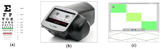 Different tools and computer software programs supporting different phases in a vision screening: (a) Snellen chart used for traditional vision screening (image downloaded from https://en.wikipedia.org/wiki/Snellen_chart#/media/File:Snellen_chart.svg, accessed date 12 October 2021); (b) Welsch Allyn Spot Vision Screener is an instrumental device used for measuring refractive error (image downloaded from https://www.gocheckkids.com/welch-allyn-spot-vision-screener, accessed date 12 October 2021); (c) C&Look is an eye-tracking computer software for screening functional vision problems.