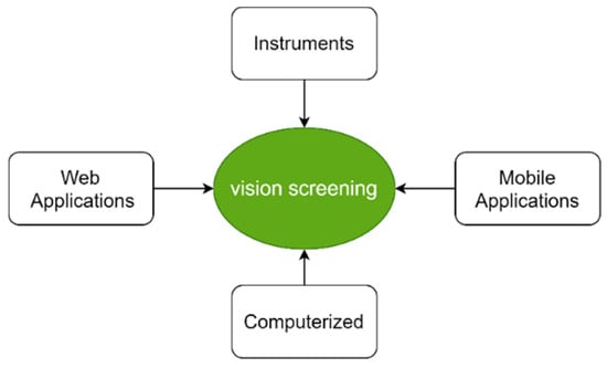 Generally, vision screening tests are carried out in primary care clinics by practitioners for checking eye health in children. Some of the tests can be supplemented by technologies. Metsing et al. [47] identified three categories for vision screening, namely, conventional (traditional or manual), instrumental, and computer software (see Figure 2). Her categories can be extended for vision training as well, and the second and the third categories can also overlap each other. In this paper, an additional category is differentiated (Section 3.4.) for web and smartphone-based software tools; the discrimination of this category often overlaps with other computer-based programs. However, this category points to newer, more affordable, and portable possibilities that appear today.