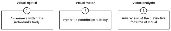 Visual information processing is a cognitive skill to extract, organize, and analyze the visual information acquired from the environment [79]. Researchers believe that visual cognition is a complex process that involves visual information processing and cognitive factors. These work together to recognize the object from the scene using prior knowledge and retina input [80,81]. Scheiman [7] divides the information processing mechanism into three components: visual analysis, visual-spatial, and visual-motor processes. Figure 4 provides a basic description of these three components. These components represent specific skills of the individuals involved in performing tasks or activities. The literature argues that poor information processing skills such as visual-spatial and visual-motor integration, and visual analysis skills, are critical for school children [82].