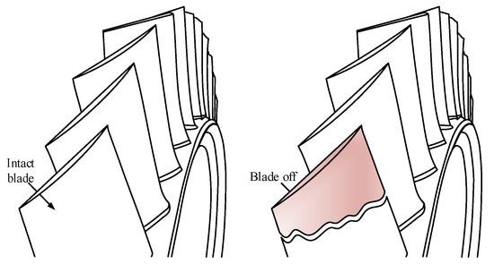 In view of the fact that the blade loss can easily cause severe vibration which may cause greater damage to the whole unit and seriously threatens flight safety, a lot of works on the blade off event have been done by scholars and demonstrated that the dynamic characteristics of the rotor suffering blade off fault are those primarily affecting aircraft safety. Obviously, the instantaneous sudden imbalance load due to blade off has a significant impact on the vibration response of the rotor system. Wang et al. [5], Kailinowski et al. [6], and Genta et al. [7], respectively, built a dynamic model for a Jeffcott rotor with blade off fault. Their research results show that the transient unbalance excitation generated by the blade off causes an instantaneous increase in rotor amplitude, and its vibration magnitude is closely related to the weight of the lost blade, the axial position, and the initial operating condition. Kalinowski et al. [6] defined the ratio of the transient response peak to the steady-state amplitude as the impact coefficient due to sudden imbalance, which is used to measure the impact effect under blade off fault. An overhung fan rotor was taken as the research object by Wang et al. [8,9] for investigating the sudden imbalance response and carrying out a fusing design suffering blade out. Li et al. [10] also investigated the transient dynamic characteristics of a cantilever single-disk rotor under sudden unbalance load. In order to analyze the response characteristics of the rotor system under sudden unbalanced excitation during the blade loss process, Sinha et al. [11,12] simplified the low-pressure rotor of a turbofan engine with a high bypass ratio to a cantilever rotor model with blades. Wei et al. [13] constructed a dynamic model of fan shaft-gear system using a Euler–Bernoulli beam element considering shear deformation. Based on this, they studied the shaft center orbits under blade loss load and vibration characteristics under windmill status. By simplifying the turbofan engine low-pressure flexible rotor into a single-disk cantilever rotor, Hong et al. [14] established a dynamic model with sudden unbalance excitation, which considered stiffness and mass distribution characteristics and load transfer characteristics. With the help of Dyrobes dynamics software, Bin et al. [15] simulated the transient response due to the last stage blade loss in a 600 MW supercritical steam turbine low-pressure rotor by applying the transient excitation force under the condition that the rotation speed was fixed at 3000 r/min and disk asymmetry was not considered. Li et al. [16] studied the dynamic characteristics of a single-disk cantilever rotor under extreme load with blade loss and carried out the safety design of support. Wang et al. [17,18,19] derived the motion equation of a typical disk-type rotor by means of the lump parameter method [17,18] and finite element method [19], respectively. Based on the model established, the internal resistance effect [17], imbalance effect [18], and bi-stable vibration characteristics [19] were studied. Based on Galerkin and Ansys, Wang et al. [20] investigated the nonlinear dynamics of the blade tip impacted, where the research object was still the cantilever fan rotor of the turbofan engine. Meanwhile, the impact effect caused by blade loss was not studied. For these complex vibration signals, Mercorelli [21,22] and Schimmack et al. [23,24] proposed a method for denoising and harmonic detection by using a non-orthogonal wavelet packet, which can isolate interference or non-coherent parts well.