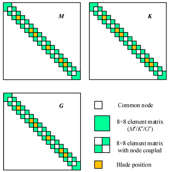 Once all of the sub-element beam equations in each main element are deduced into the 8 × 8 main matrix on the basis of Guyan theory, the mass matrix (Mr), the stiffness matrix (Kr), and the gyroscopic matrix (Gr) for the whole rotor system can be obtained by assembling all of the main element matrices, and the assembly procedure is depicted in Figure 4. Then, based on the rotor dynamics theory, the dynamic governing equation with 72 DOFs describing the rotor motion induced by blade off is deduced as