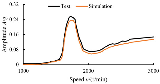 To further verify the effectiveness of the proposed modeling method for complex rotors, response simulation and corresponding vibration tests were carried out. As shown in Figure 6, the test rotor is driven by a three-phase AC motor controlled by a frequency converter, with rolling bearings at both ends (Model: UCP205). The vibration signal of the bearing seat was collected by a piezoelectric acceleration sensor (sensitivity: 98.1 mV/g), and the rotor rotation pulse signal was collected by the combination of a non-contact photoelectric sensor and reflector. In order to simulate the unbalance force caused by blade loss, a screw was added to the hole corresponding to node 4. Within the speed range of 1000–3000 r/min, the vibration response was measured at an interval of 100 r/min, and the amplitude of the steady-state response at every speed was taken to obtain the amplitude-frequency response curve, which is compared with the simulation result, as shown in Figure 7. It can be seen from the comparison of the response curves that the simulation and test results show the same trend of vibration with rotation speed, and the difference between them is small. The amplitude difference between simulation and test results is because the test rotor has a certain residual imbalance caused by machining and assembling in addition to the unbalance screw applied, which is only applied on the simulated model.
