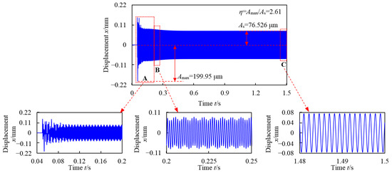 The motion Equation (14) of the gas turbine rotor system suffering from a blade off incident is solved numerically by using the Newmark-beta integral algorithm, which is an efficient calculation algorithm and meets the research objective. A time step size of 1e-5 s is specified for the numerical integration. On the basis of this, the transient response of 1.5 s is solved to show the time-frequency characteristics and the impact effect when blade off occurs at t = 0.05 s. The corresponding parameters for blade off are listed in Table 2. Taking the rotational speed and blade off location as control parameters in the simulation, the vibration time-domain waveform, spectrum, and rotor orbit are adopted to investigate the transient response and blade off mechanism of the high-speed gas turbine rotor system with complicated structure characteristics. As discussed below, the obtained results reveal the transient dynamic response and evolution of the rotor system in the case of blade off.