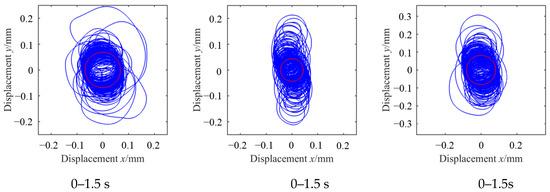 In addition to the significant impact of blade off on the vibration displacement, it also has a significant influence on the trajectory and frequency components in the response. By comparing the orbits at different times, as shown in Figure 13, it can be seen that at the moment of the blade loss, the orbit is very turbulent, with a large initial vibration amplitude, but gradually becomes a regular circle, with the vibration waveform of a simple sine wave. In addition, the motion orbits at different positions are very similar, as shown in Figure 13a–c, while the maximum response displacement and steady-state amplitude of the bearings at both ends are greater than those at the center of gravity. The reason for this is due to the dynamic characteristics of the gas generator rotor operating at 50,000 r/min. The excitation at node 14 cannot effectively excite the third-order mode (see Figure 8c), and node 11 in the excited second-order mode is much closer to the node point (see Figure 8b), so the vibration at the center of gravity is smaller than those at other positions.