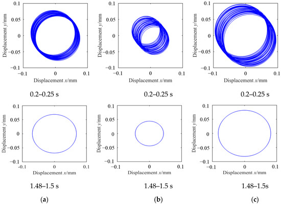 The motion orbits at different positions over time: (a) 1# bearing; (b) node 11 (C.G. position); (c) 2# bearing.