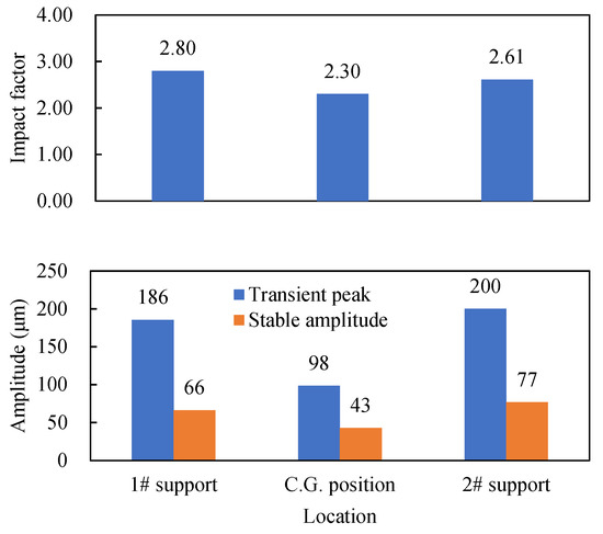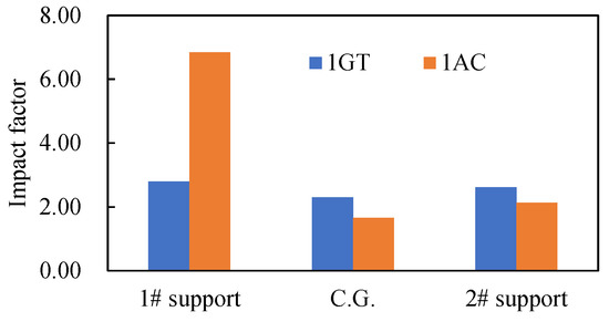Figure 20 shows the comparison of impact factors when blade off occurs at 1AC and the first-stage gas turbine (1GT). It shows that the blade off location has a significant effect on the impact factor. When the blade off location is changed from 1GT to 1AC, the impact factor at 1# support is increased from 2.8 to 6.84. In contrast, the impact factor at 2# support and the center of gravity position does not increase but decrease, although the decrease is small. This is because the sudden unbalance excitation at different locations has a distinct sensitivity to each mode of the rotor operating at a certain speed. The details are as follows. It can be seen from the mode shapes shown in Figure 8 that the first three-order critical modes can be effectively excited by the excitation at 1AC, while the excitation at 1GT can only excite the first two modes. In addition, the effects of the sudden unbalance excitation at different locations on each mode are inconsistent. Namely, the first-order critical mode (Figure 8a) is easier to be excited by the excitation at 1GT than that at 1AC, while the second- and third-order critical modes are just the opposite, especially for the third-order mode (Figure 8c), which can hardly be excited by the excitation at 1GT since the vibration node point is near 1GT. The above reasons will cause the transient response excited by the blade loss of 1AC to be greater than that caused by the loss of the 1GT blade. From the steady-state vibration mode (Figure 21) caused by the large unbalance excitation at 1AC, it can be seen that the steady-state amplitude of 1# support is smaller than that of the C.G. position and 2# support. As a result, when the blade loss occurs at 1AC, the large transient response peak and the smaller steady-state vibration amplitude at 1# support cause a large impact factor. Apparently, the 1# bearing and its supporting structure are most vulnerable to damage, such that some safety design methods need to be adopted.