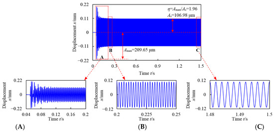 The time-domain response of 1# bearing in the horizontal direction when the rotor operates at 30,000 r/min: (A) 0.04–0.2 s; (B) 0.2–0.25 s; (C) 1.48–1.5 s.
