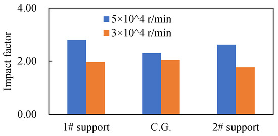 As we all know, the rotational speed has a significant influence on the dynamic characteristics. In view of this, this section studies the influence of rotating speed. Figure 17 represents the vibration response in time domain, and Figure 18 shows the response in the frequency domain at different nodes when the rotor operates at 30,000 r/min, which is the lower limit of the working speed. The corresponding impact factors at the maximum and minimum operating speeds are both shown in Figure 19. By comparing the time-domain and frequency-domain responses at different speeds, i.e., comparing Figure 5 with Figure 10 and comparing Figure 14 with Figure 18, it can be seen that the time-domain and frequency-domain responses at different speeds have similar characteristics (the vibration amplitude increases suddenly when blade off event occurs and then decays to a stable value; in addition, the first natural frequency and the second forward and backward processional frequencies can be excited by the impact load, while the amplitude with a higher-order frequency has a faster attenuation rate), while for all the nodes, the impact factor of 50,000 r/min is greater than that of 30,000 r/min (see Figure 19), which indicates that the higher the speed, the more susceptible the rotor motion state is to the impact load, i.e., within the working speed range, the rotor system operating at higher speeds is more sensitive to impact load, which is consistent with the results reported in [9,14].
