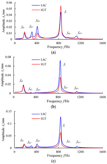 The frequency-domain responses at the instantaneous stage (0.05–0.12 s) when blade off occurs at two different locations (1AC and 1GT) are shown in Figure 22. Obviously, there are big differences in the frequency components between these two cases. It can be seen from Figure 22 that the sudden unbalance excitation at 1AC can excite the first three-order natural modes simultaneously (fn1, fn2−, fn2+, fn3−, fn3+), while the excitation at 1GT can only excite the first two modes (fn1, fn2−, fn2+). Furthermore, the amplitudes of the second-order modes (fn2−, fn2+) excited by the sudden unbalance excitation at 1AC are larger than those excited by 1GT. For example, when the blade off event changes from 1GT to 1AC, the amplitude of the second backward precession frequency component increases from 5.27 μm to 12.3 μm. Another significant vibration difference between these two cases of blade off can also be observed in Figure 22a,c, i.e., in all the natural modes excited by sudden unbalance excitation, when the blade off occurs at 1GT, the first natural frequency component has the largest amplitude; however, the amplitude of the second forward natural frequency component is the largest when the blade off occurs at 1AC.