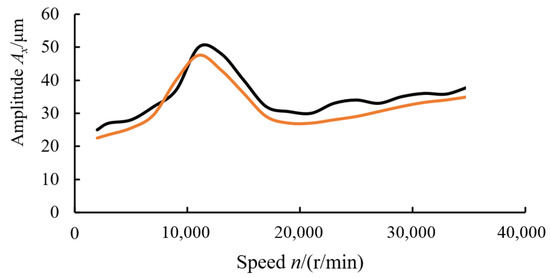 In order to verify the reliability of the rotor model established, the unbalance response obtained by simulation is compared with the measured data. According to the data of the residual unbalance displayed by the dynamic balancing machine, unbalances of 35 g·mm and 25 g·mm are applied to node 7 and node 15 of the dynamic model established, respectively. The amplitude-frequency response curves corresponding to node 13 obtained by the simulation and measurement are shown in Figure 23. The comparison analysis shows that the simulation and test results are basically consistent, which indicates that the model has enough accuracy. Because node 13 is close to the node position of the second-order mode shape (see Figure 8b), there is no second-order resonance peak in the unbalance response versus speed curves. The response error between simulation and measured data is mainly caused by machining and assembly. Overall, the dynamic model established in the study is effective and suitable.