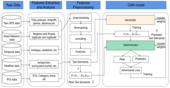 This section introduces the proposed taxi demand forecasting model in detail, including raw data, features extraction and analysis, features pre-processing, and the GAN model. Figure 1 depicts the framework of the proposed model.