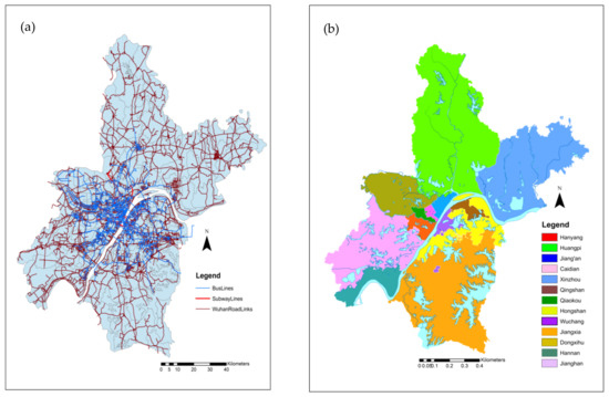 (a) Road network, (b) Main regions of the city of Wuhan.